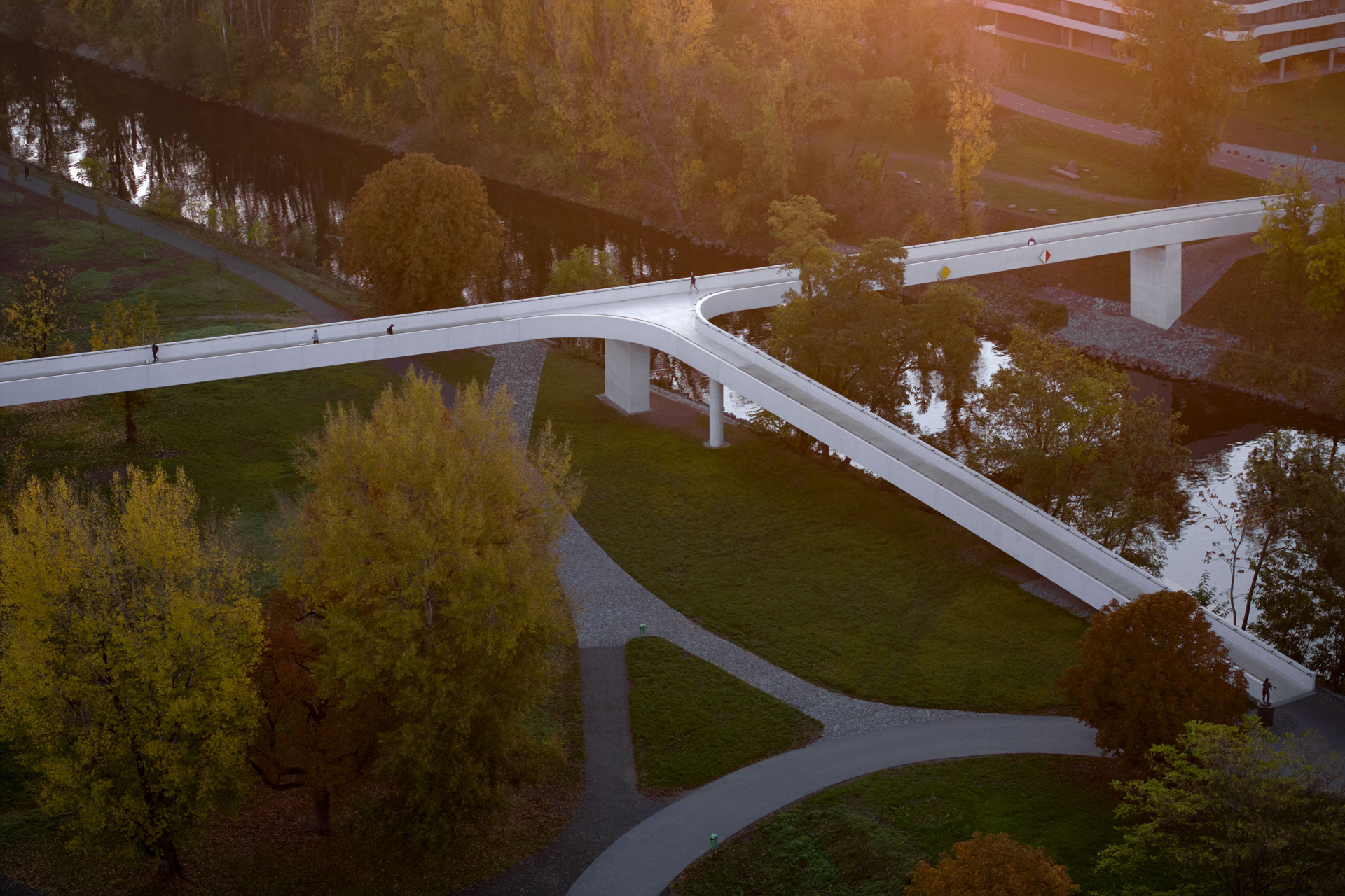 Pěší most Štvanice spojuje čtvrti Karlín a Holešovice a překlenuje nejen řeku, ale i rozdíl mezi dvěma světy – Karlín s kancelářemi a luxusními restauracemi na jedné straně a Holešovice s přeměněnými továrnami, dnes kavárnami a galerijními prostory, na straně druhé.