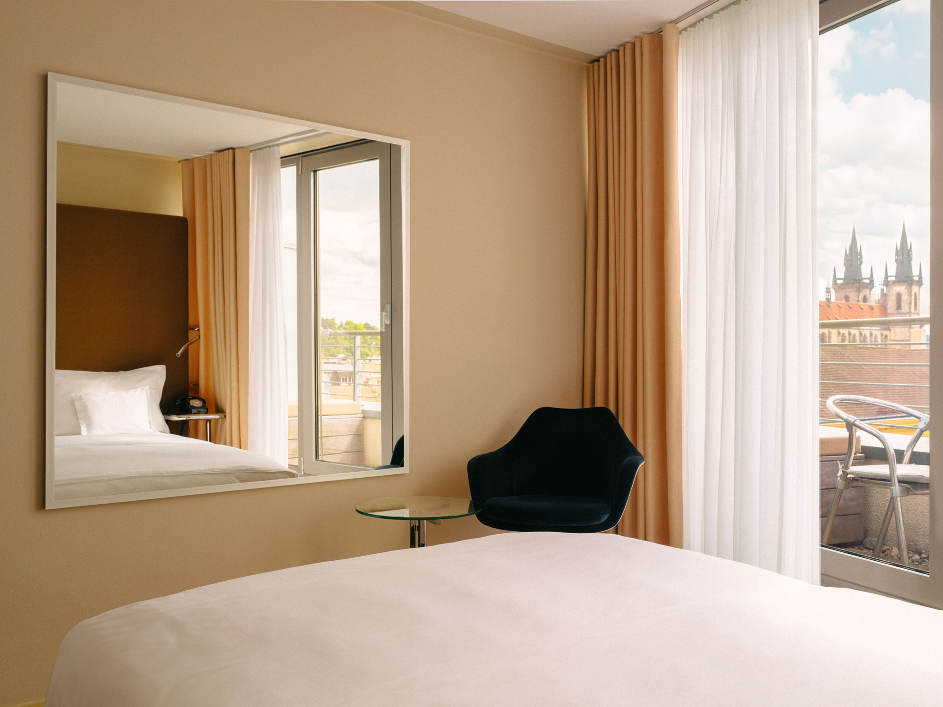 Velkorysý vzdušný pokoj s vlastním balkonem a Prahou jako na dlani. S king-size postelí, ikonickým designovým nábytkem, teplými akcenty a záplavou denního světla se tento elegantní pokoj s výhledem na Pražský hrad hodí i pro ty nejnáročnější hosty. Dopřejte si čas a vychutnejte si tento prostor s drinkem v ruce; pokud si tento pokoj zarezervujete, první koktejl je na nás! Nejlépe si ho vychutnáte při západu slunce na Vašem soukromém balkoně.